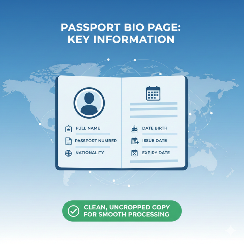 You must upload a clear, readable digital copy of your passport’s bio page, showing: