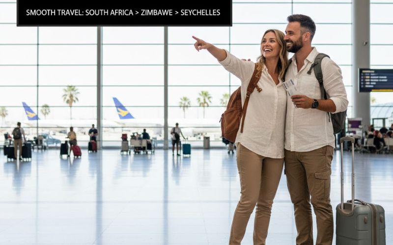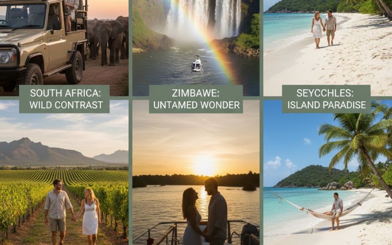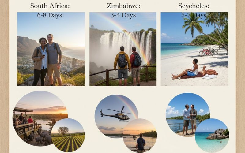 - Order of travel: A common itinerary might be: Start in South Africa, then fly to Zimbabwe for the falls ,safari, and finally hop to Seychelles for a relaxing beach stay.