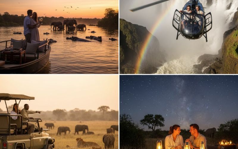 - Victoria Falls (2 days): Viewpoints, helicopter ride, sunset cruise