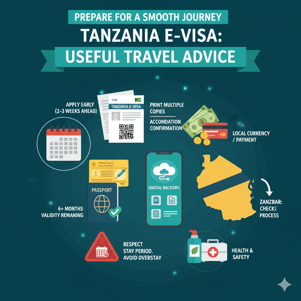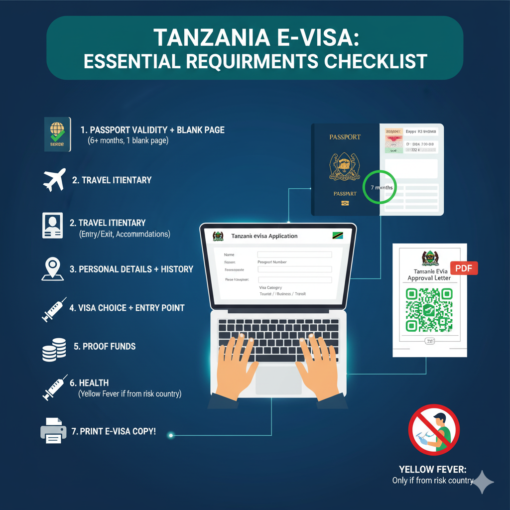 Planning ahead is the key to enjoying your safari, beach escape or island hopping in Tanzania without unnecessary stress. By sorting out your Tanzania e-visa, ticking off all the âRequirements for an e-Visa Tanzaniaâ, and checking your travel and health preparations, youâll arrive fully ready to explore. The wild landscapes of Serengeti, the vibrant culture of Dar es Salaam, the marine magic of Zanzibarâtheyâre waiting. Travel smart, pack well, apply earlyâand your Tanzanian adventure will be off to a smooth start.