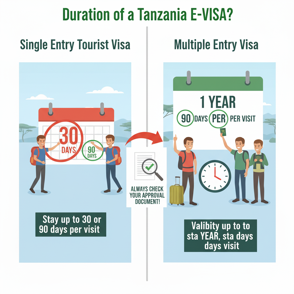 The types you can choose from will depend on how long you plan to stay and whether you want single or multiple entries. Weâll cover the âTanzania eVisa typesâ later in more detail.
