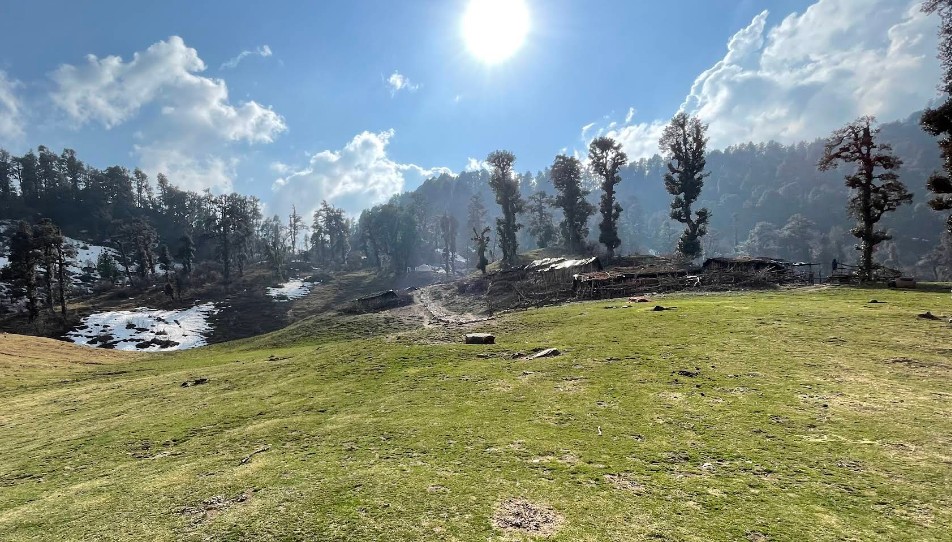 Though known as a winter trek, Kedarkantha is equally charming in summer. The snow melts, revealing grassy trails, blooming flowers, and amazing mountain views.
