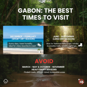 June to September (long dry season) â Considered the best for visiting national parks like Lope and Ivindo, as trails are accessible and wildlife sightings are more frequent.