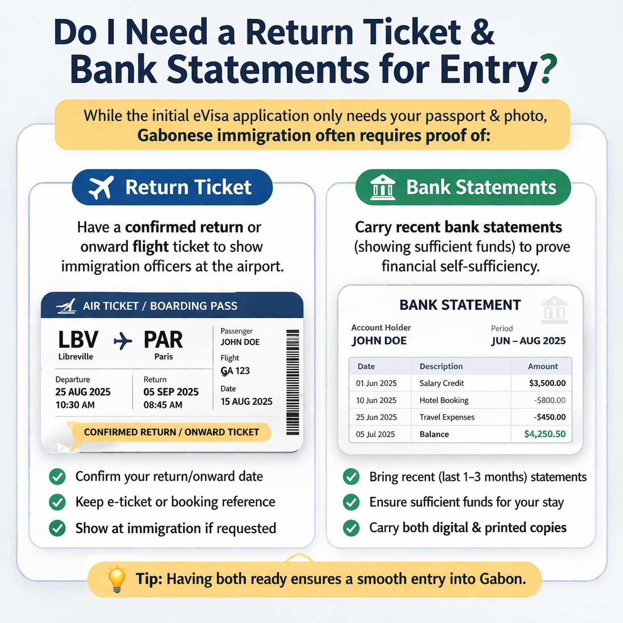 While the initial eVisa application only requires your passport and photo, Gabonese immigration rules often require travelers to prove their intent to return and their financial self-sufficiency upon arrival: