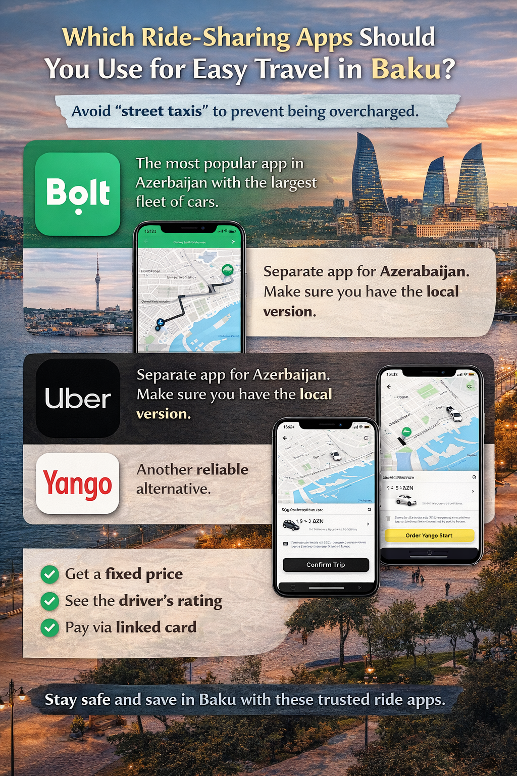 Once you have arrived and cleared immigration, getting around Baku is incredibly affordable and tech-friendly. We strongly advise against using "street taxis" where you have to negotiate the fare, as tourists are often overcharged. Instead, download and use reliable Ride Apps: