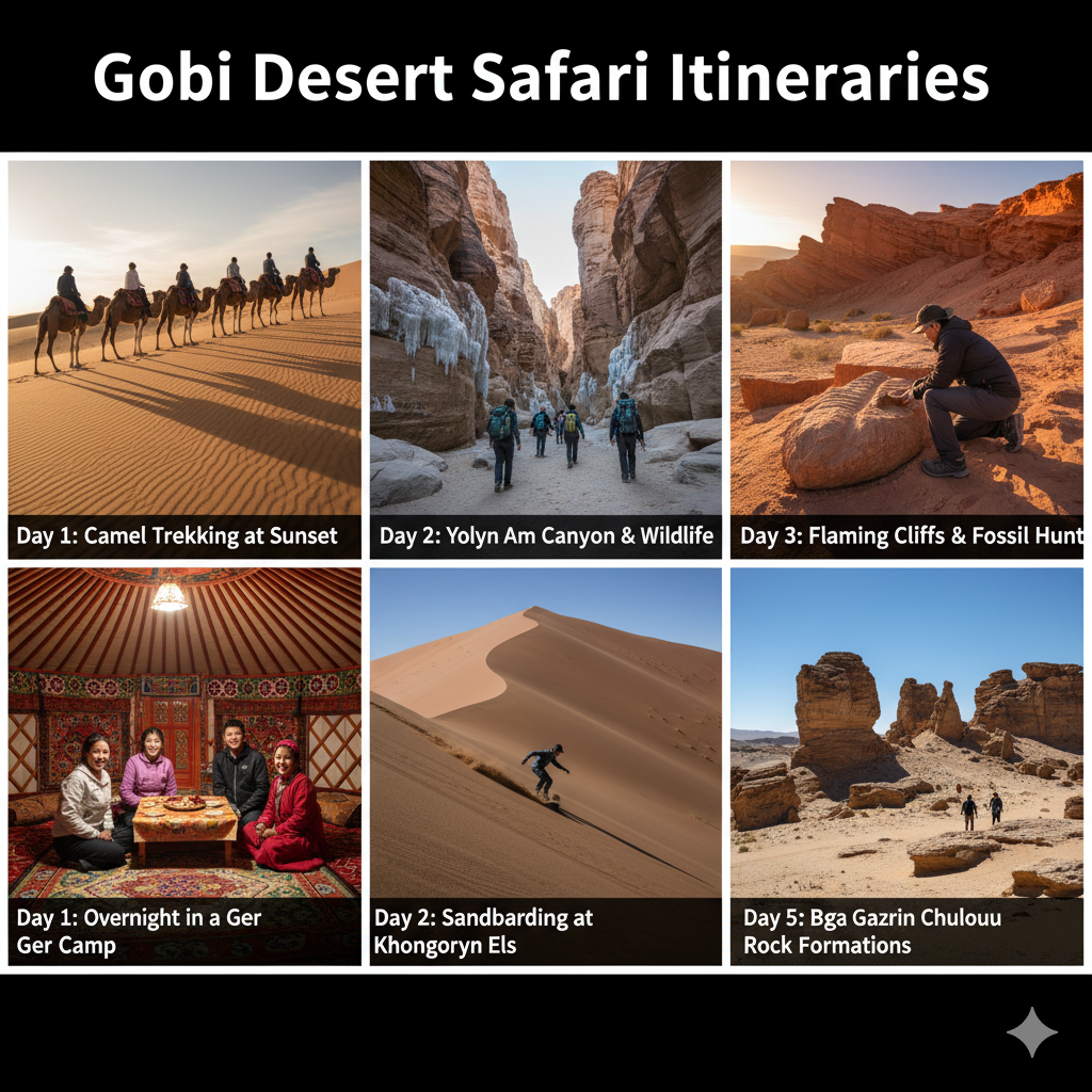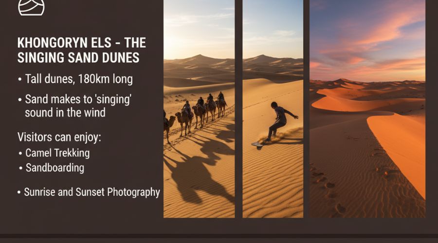 The Gobi Desert is replete with great natural and cultural sites that render each safari a memorable experience. The different destinations have contrasting views, fauna and experiences to the visitors who want to experience adventure, capture photographs and have the culture. The following are the places one should not miss: