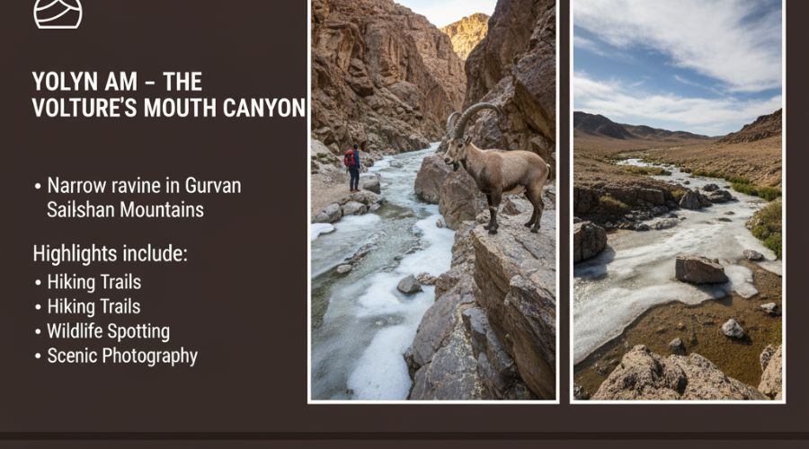 Yolyn Am is a narrow ravine that is located inside the Gurvan Saikhan Mountains and is a stunning natural attraction. This canyon is also referred to as the Vultures Mouth because it is very deep, and it is icy even in summer. Highlights include: