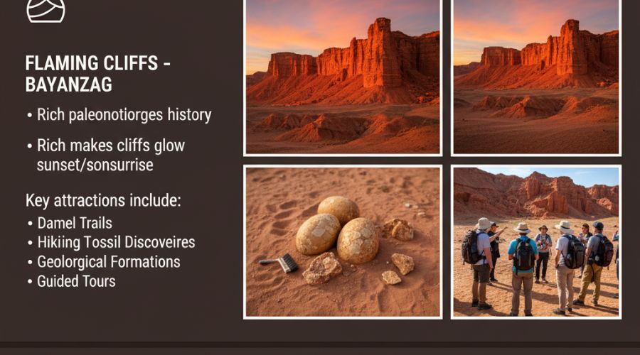 The Flaming Cliffs are known to have a rich paleontological history. These red-orange cliffs are swirling brightsome at sunset and sunrise and thus are aesthetically beautiful. Key attractions include: