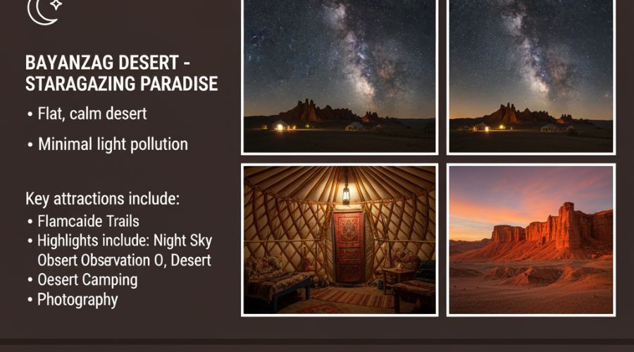 The Bayanzag desert, commonly known as the Place of the Flaming Cliffs, is a flat and calm desert that is ideal in stargazing. Highlights include: