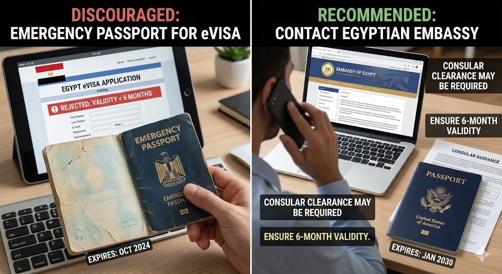 While Egypt's border control may accept certain temporary or emergency travel documents, applying for the eVisa with anything other than a standard passport is highly discouraged. The most critical requirement is that the travel document—temporary or standard—must have a validity of at least six months beyond your arrival date in Egypt.