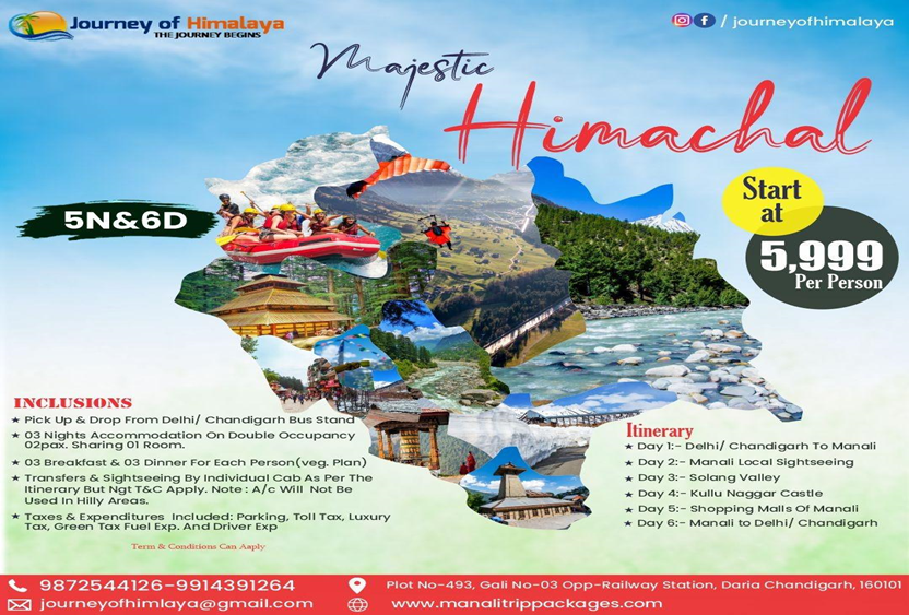 Browse our customisable Places to visit in Himachal Tour Package and tell us your dates, group size, and preferred vibe. Whether youâre chasing snow or sunshine, Journey Of Himalaya will map it your way. A smart, flexible itinerary means you see more, rush less, and carry home the calm of the mountainsâexactly what a mountain escape should be.