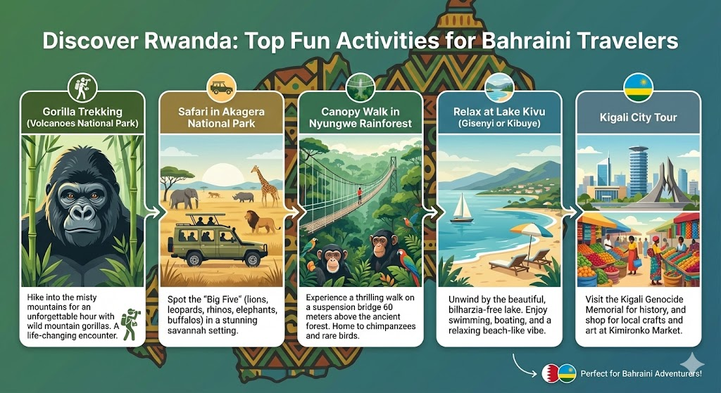 For residents of Bahrain, the Kingdom of Pearls, the lush, mist-covered mountains of Rwanda offer a stark and beautiful contrast to the desert landscapes of the Gulf. Known as the "Land of a Thousand Hills," Rwanda has emerged as one of Africa's safest, cleanest, and most dynamic destinations. Whether you are trading the skyscrapers of Manama for the green hills of Kigali or the warm waters of the Persian Gulf for the deep waters of Lake Kivu, Rwanda is a destination that promises adventure.