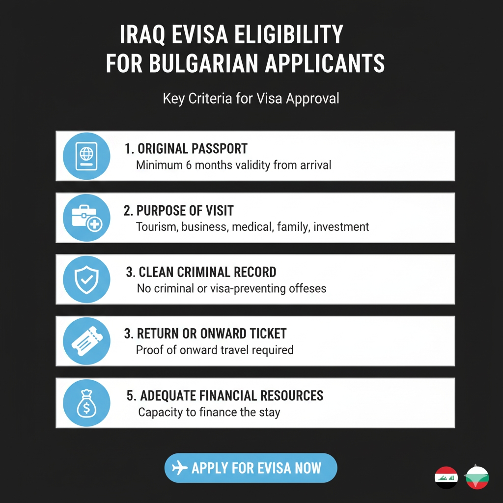 The Eligible for Bulgarian eVisa passports and residents are free to seek an Iraq eVisa in the event they fulfill the following criteria: