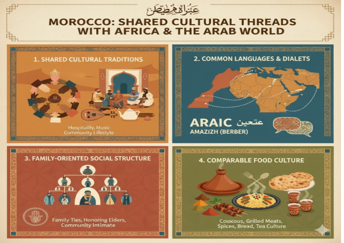 Morocco has some cultural traits in common with South Africa and the Arab world, for example, hospitality, socializing, traditional music, and lifestyles based on the community.