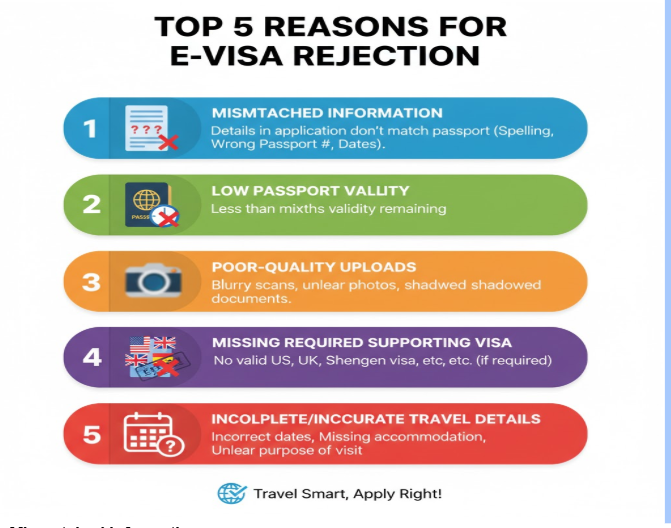 Incorrect travel dates, accommodation information missing, or unclear purpose for visit can also result in rejection.