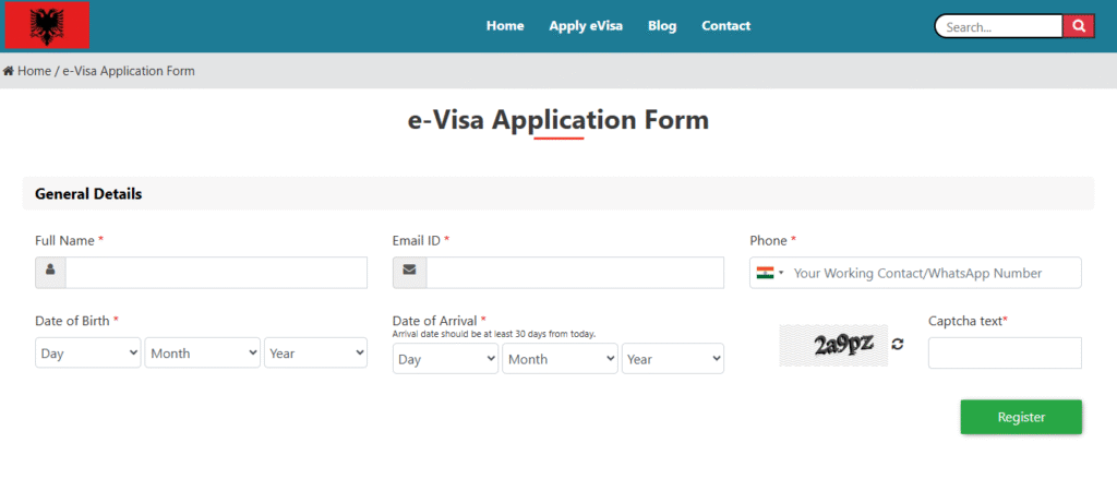 Complete the Albania visa form online. Fill in your name, nationality, passport details, travel purpose, and dates carefully.