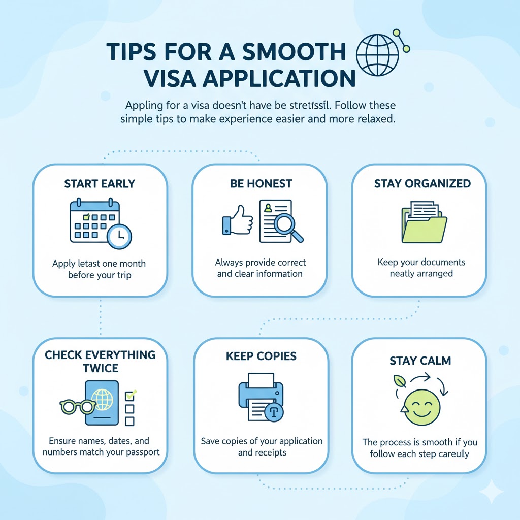 Applying for a visa does not have to be stressful. Follow these simple tips to make your experience easier and more relaxed: