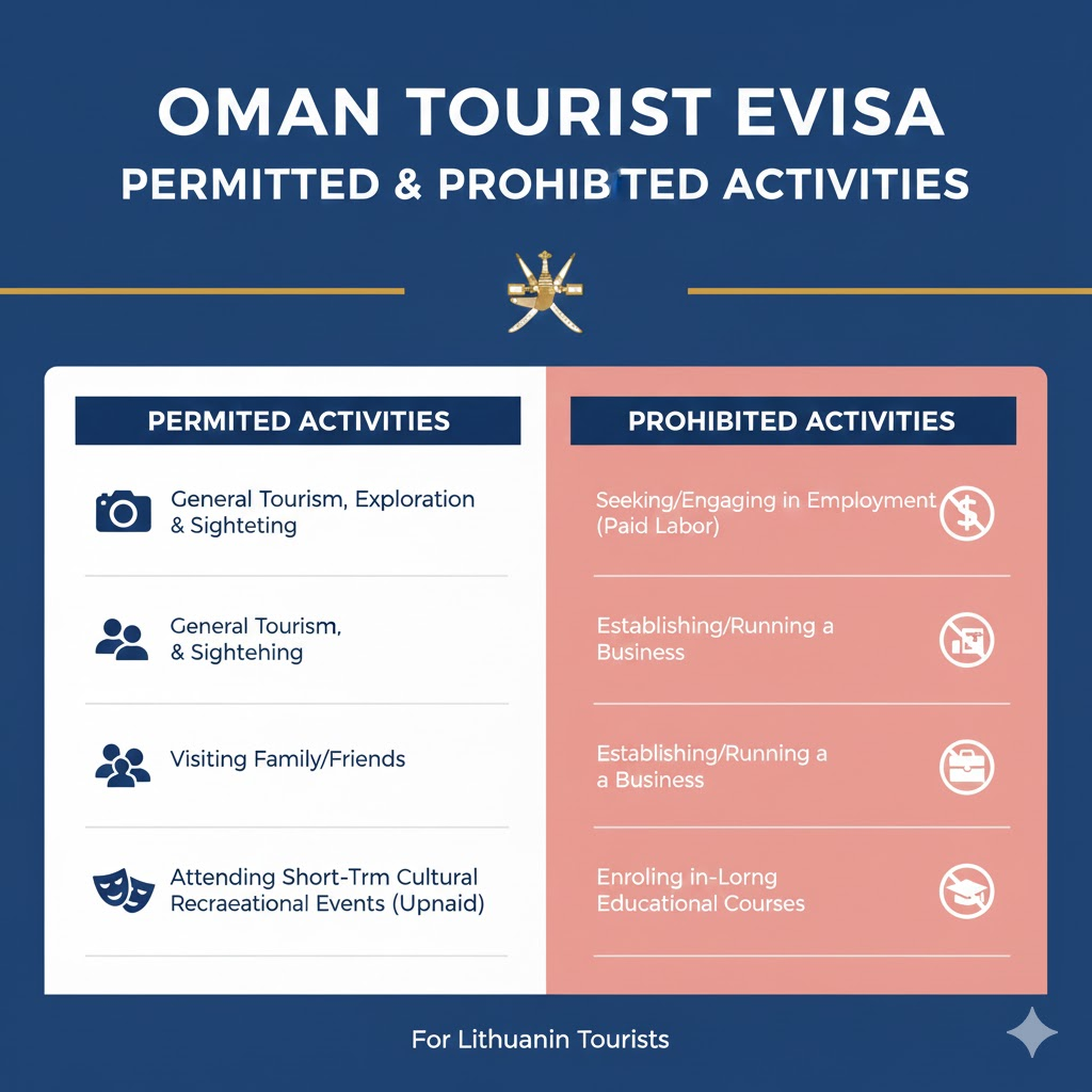 The Oman Tourist eVisa is exclusively designed for leisure. Permitted activities for Lithuanian tourists include: