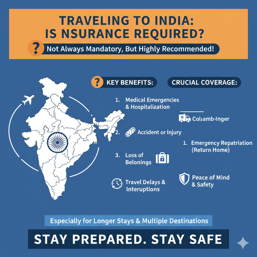 Though insurance may not always be a mandatory requirement for each type of visa, it is highly recommended when traveling to India, especially if the length of the stay is considerable and the traveler plans to visit different places.