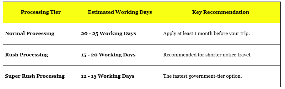 Processing times are substantial due to necessary government security checks. You must apply well in advance. The standard government timeline, reflected in the application tiers, is: