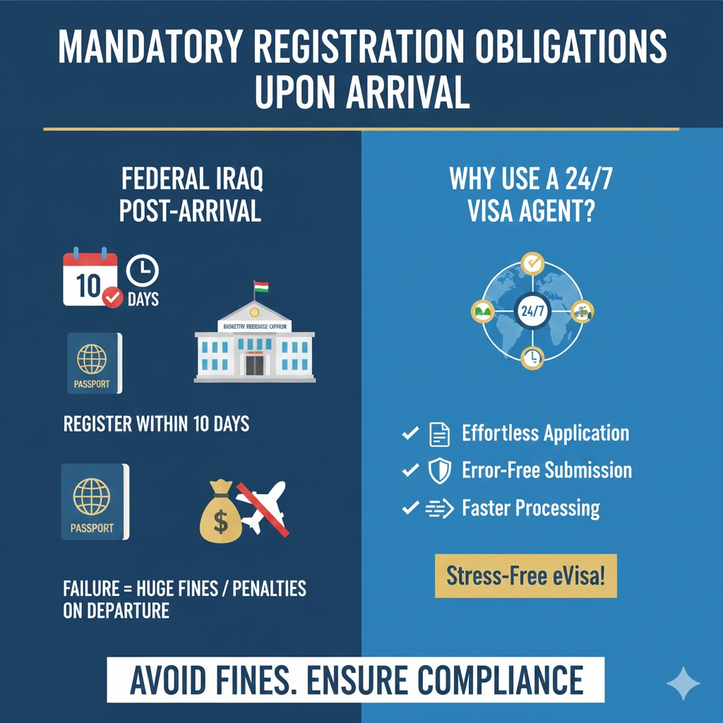 Upon arriving in Federal Iraq, Canadian citizens (and most foreign nationals) must adhere to a crucial post-arrival requirement. You must register your arrival with the Iraqi Residence Office (Ministry of Interior) within the first ten days of entering the country. Failure to complete this step will result in significant fines or penalties upon your departure.