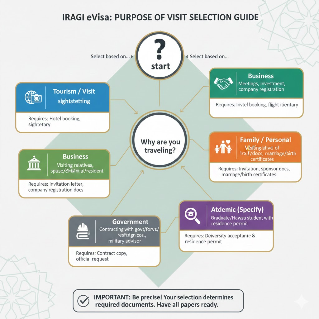 The Iraqi eVisa application requires a clear Purpose of Visit. This selection directly affects the supporting documents you must provide. The possible reasons are extensive, covering nearly all reasons for travel:
