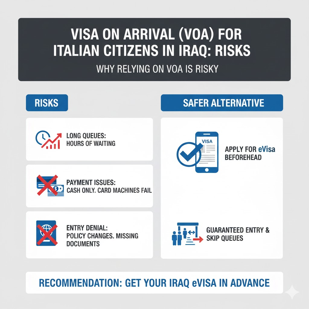 This is a critical question. While Iraq has previously offered Visa on Arrival to EU citizens at major airports (Baghdad, Basra, Najaf), the policy can change without notice. Relying on VOA carries risks: