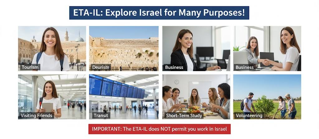 The ETA-IL covers most short-term, non-remunerative travel to Israel. Common purposes include: