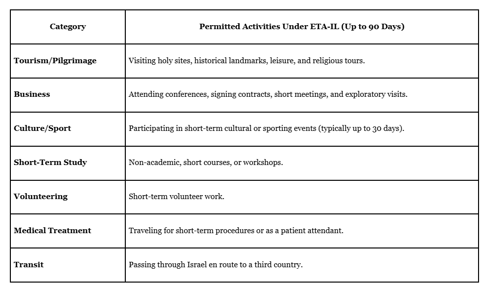 The ETA-IL covers nearly all non-employment and non-long-term stay activities for South African travelers. If your travel falls under one of these categories, the ETA-IL is the correct path: