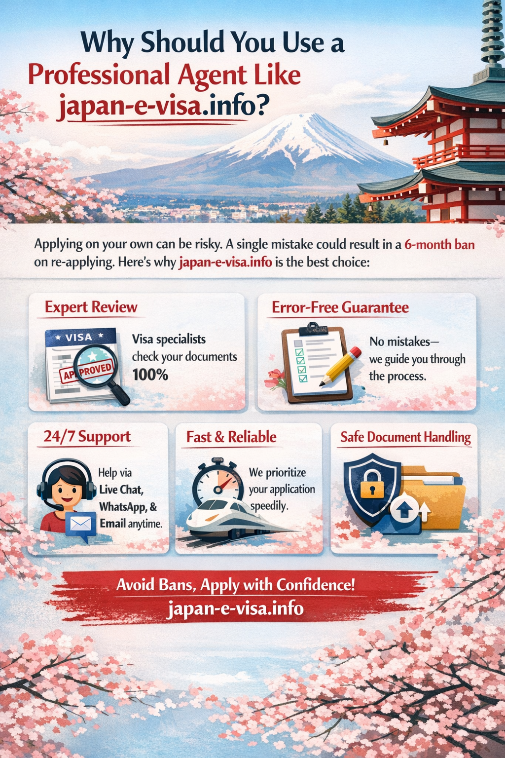 While you can apply on your own, the Japanese visa system is known for its strictness. A single error can lead to a 6-month ban on re-applying. Using japan-e-visa.info provides several advantages:
