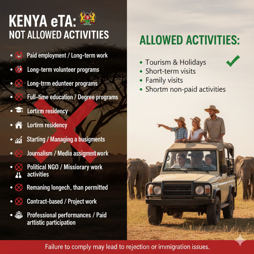 These activities necessitate different permits, and if you have a standard Kenya E-TA and decide to engage in these activities, your application will be rejected: Paid employment or long-term work, long-term volunteer programs Full-time education or degree programs, Long-term stay for residency Starting or managing a business inside Kenya Journalism or media assignments, long-term NGO or missionary work, political, research, or diplomatic activities Remaining in Kenya longer than permitted work that earns income inside Kenya Contract-based or project work Professional performances or paid artistic participation. Performing any of the above on a Kenya eTA may lead to rejection or issues at immigration. If you adhere to what the authorization stipulates, you will be able to have a trouble-free ββββββββββββββββtrip.