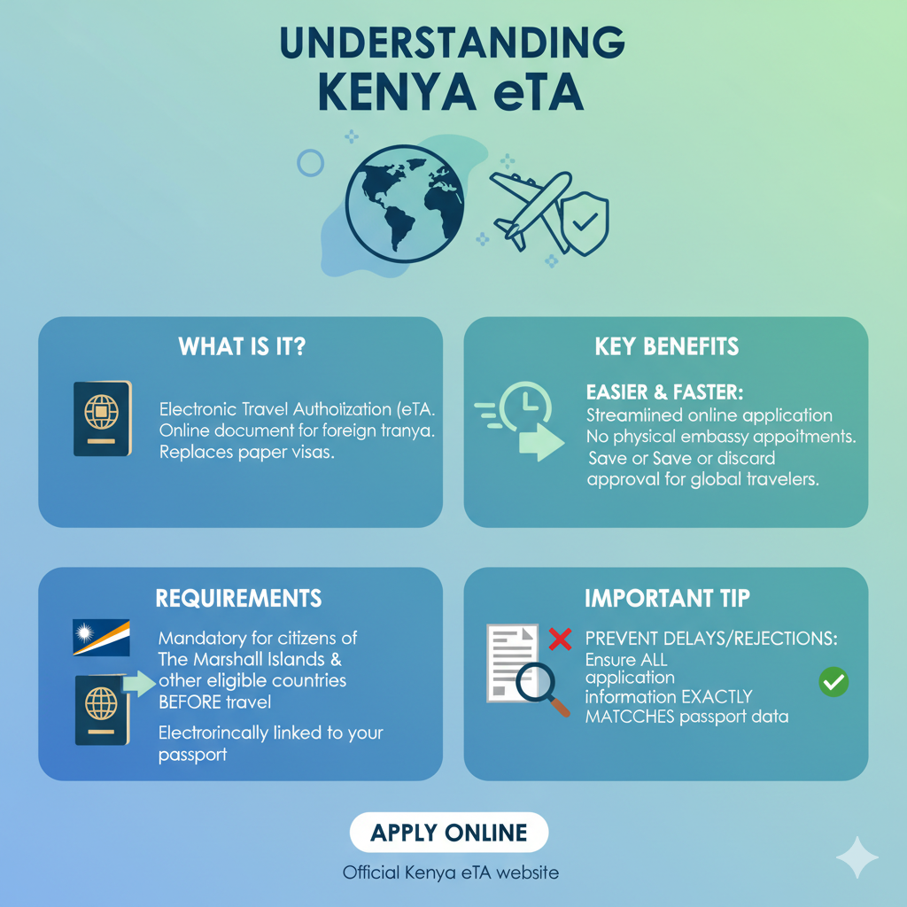 The Kenya eTA (Electronic Travel Authorization) has made traveling to Kenya easier, quicker, and more convenient for the citizens of the Marshall Islands. This online system does not require any paperwork or a visit to the external offices; hence, the travelers are able to apply online and get the authorization electronically. Regardless of your intention, be it tourism, business, transit, or visiting family, the Kenya eTA for Marshall Islands citizens is an entry point to the beautiful Kenyan sights and a blend of diverse cultures.