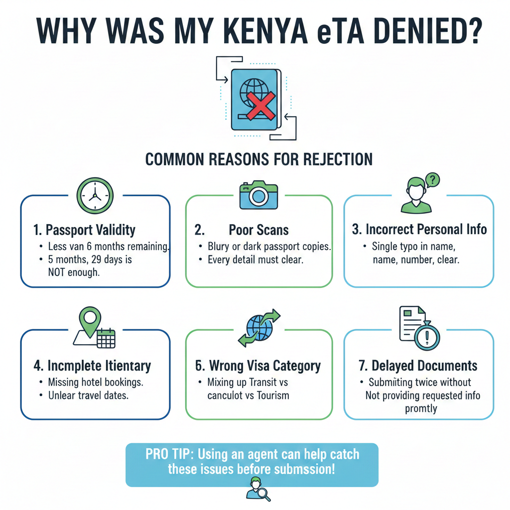 Although the Kenya eTA is straightforward, mistakes still happen. Here are the issues that cause most rejections: