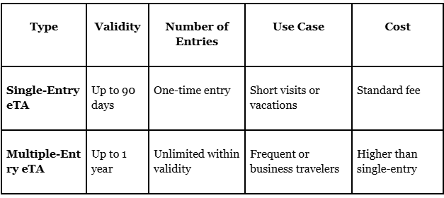 Below is a quick comparison between the Single-Entry and Multiple-Entry eTA options: