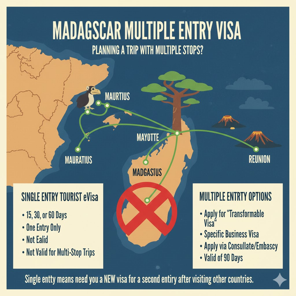 What does this mean for you? If you plan to combine your trip to Madagascar with a visit to Mauritius or Mayotte and then return to Madagascar before flying back to Reunion, a Single Entry visa will not suffice for the second entry. You would need to apply for a new visa for your second entry.