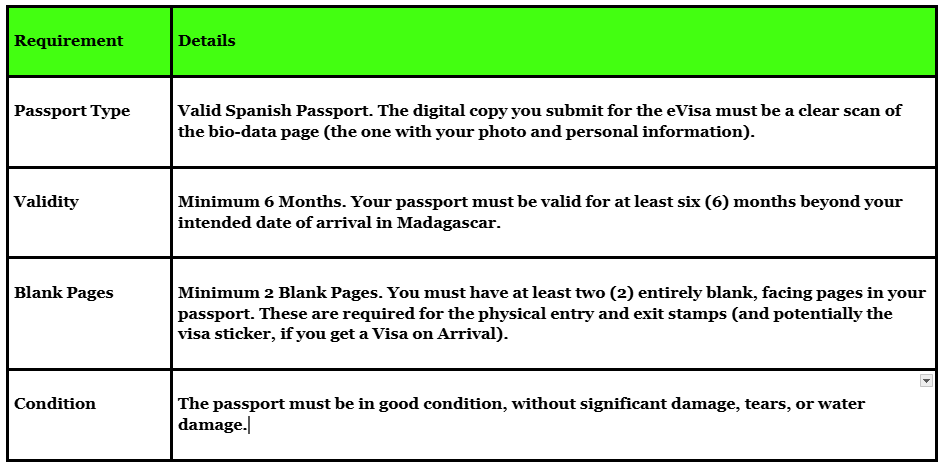 To apply for the Madagascar eVisa from Spain, you must have the following documents ready in digital format (JPG or PDF). If opting for a Visa on Arrival, you must carry physical copies of these documents.