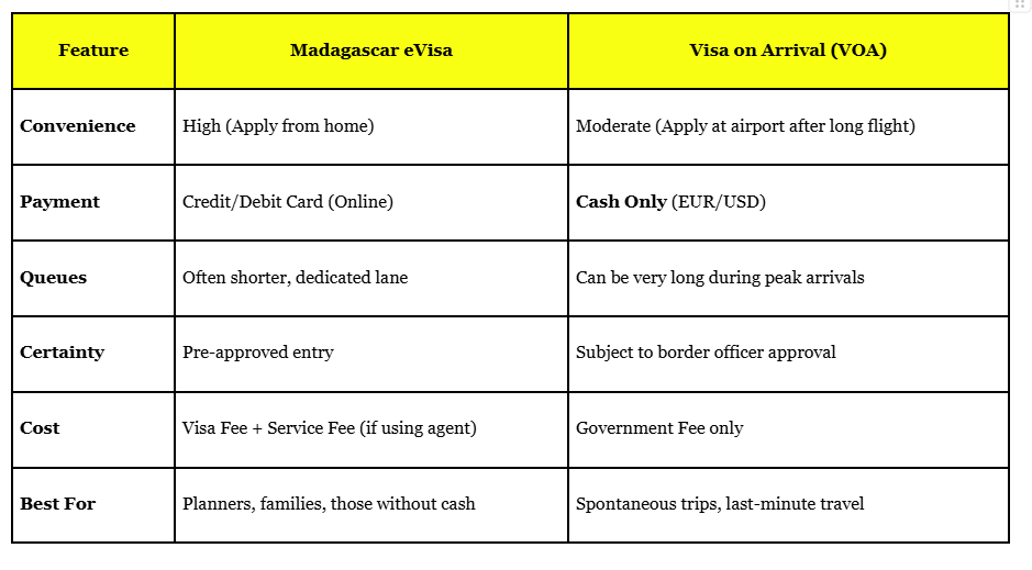 What are the pros and cons of an e-visa versus a visa on arrival for Madagascar?