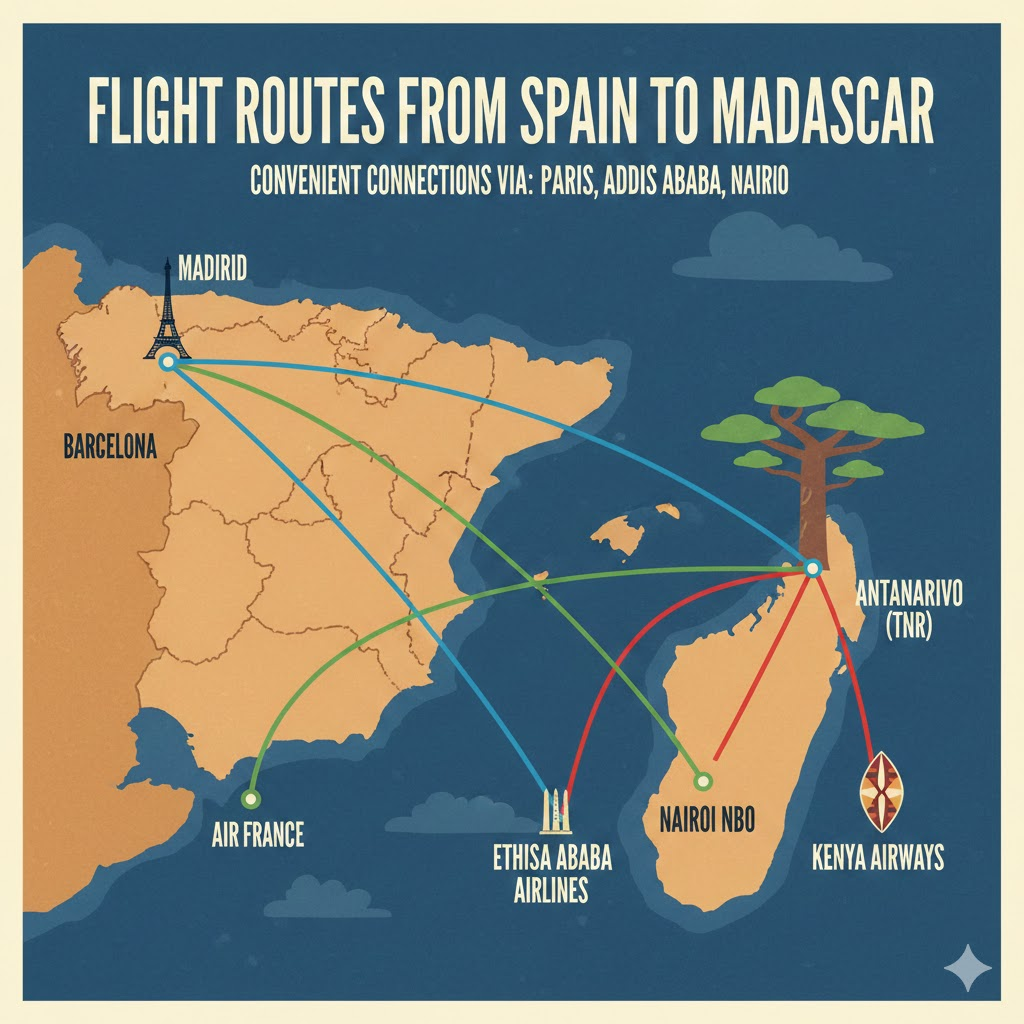 - Air France: Flights from Madrid (MAD) or Barcelona (BCN) via Paris (CDG) to Antananarivo (TNR).