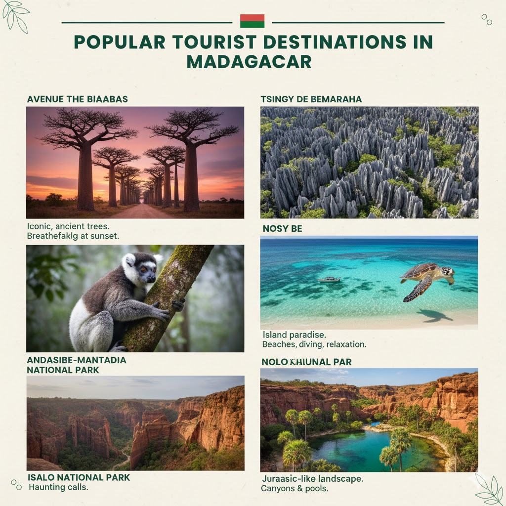 - Tsingy de Bemaraha: A UNESCO World Heritage site known for its razor-sharp limestone pinnacles and "stone forests."