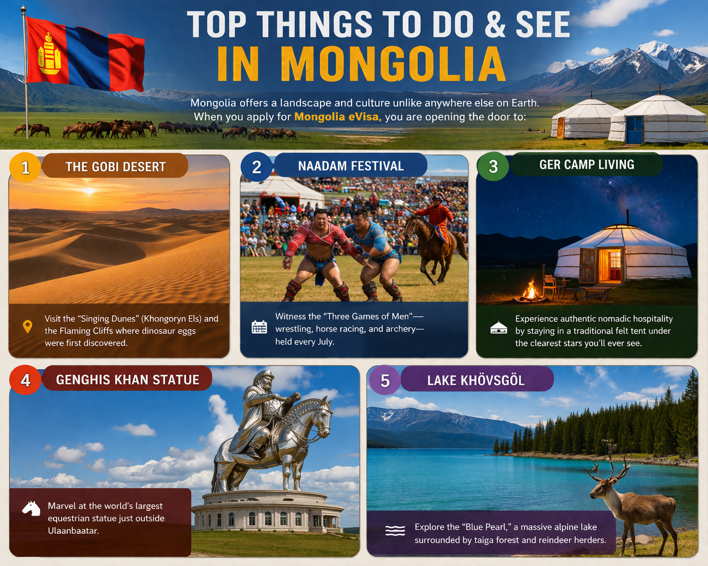 Mongolia offers a landscape and culture unlike anywhere else on Earth. When you apply for Mongolia eVisa, you are opening the door to: