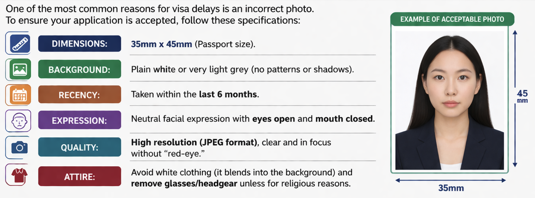 One of the most common reasons for visa delays is an incorrect photo. To ensure your application is accepted, follow these specifications: