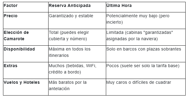 No existe una única respuesta a la pregunta de cuándo reservar. Si viajas en familia, necesitas cabinas conectadas o quieres un itinerario especÃfico en temporada alta (como Navidad o verano), apuesta siempre por los descuentos por reserva anticipada. Por el contrario, si viajas solo o en pareja y el destino te es indiferente, mantente atento a cualquier oferta de crucero de última hora que aparezca en el radar. Para más información, llamar al crucero directamente.