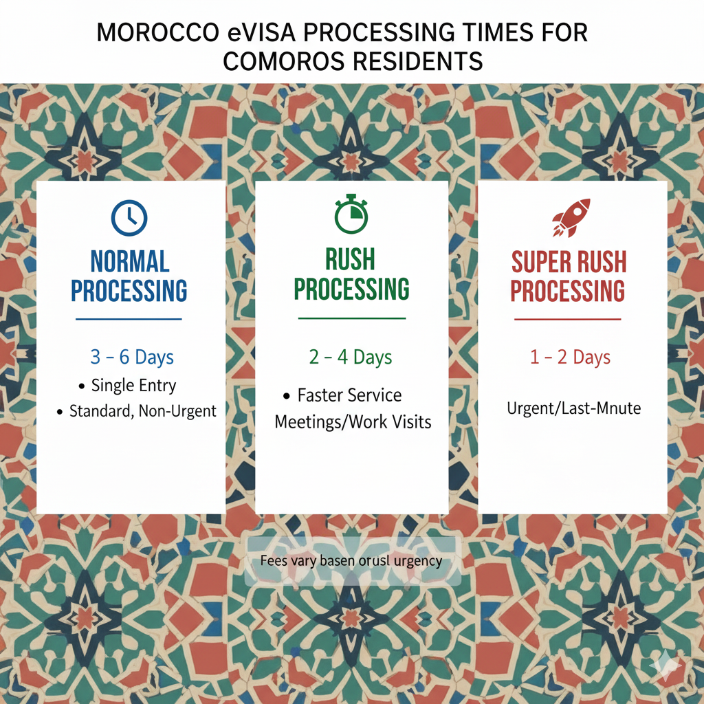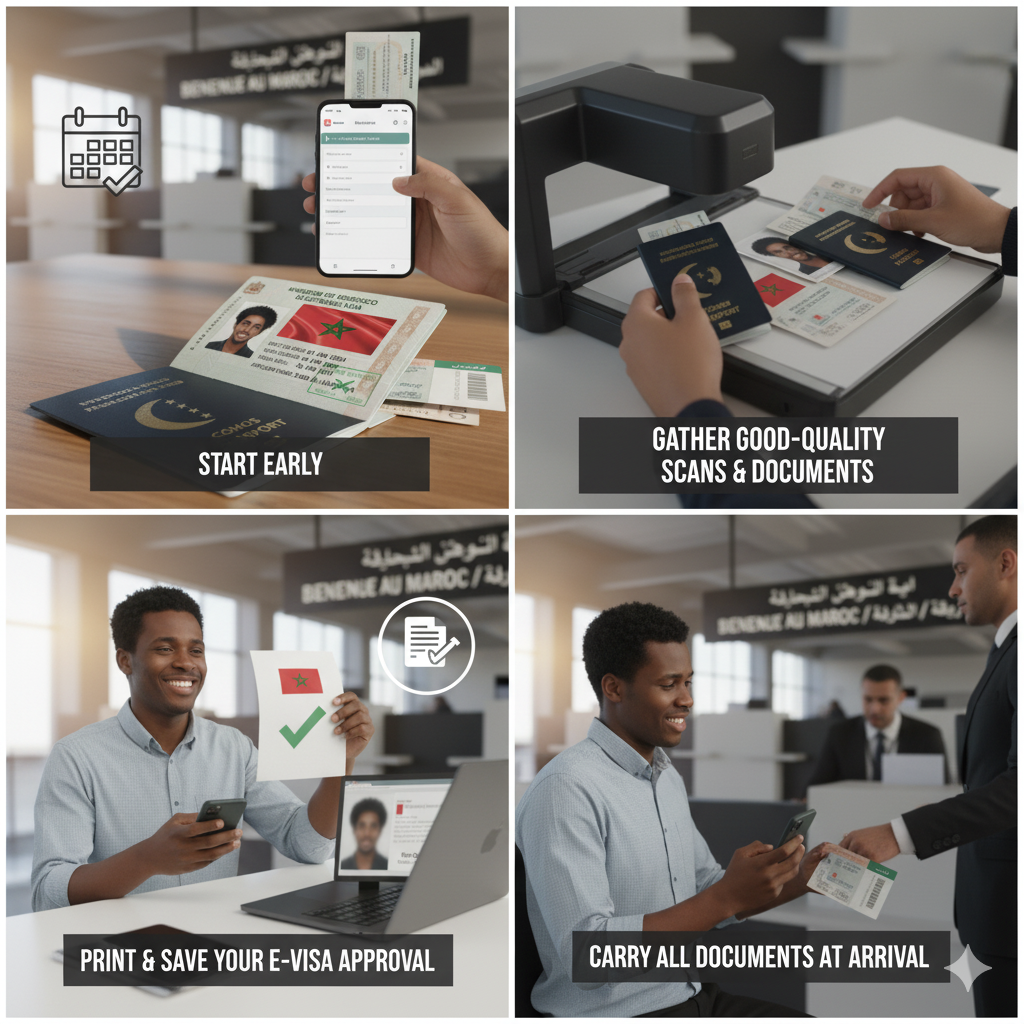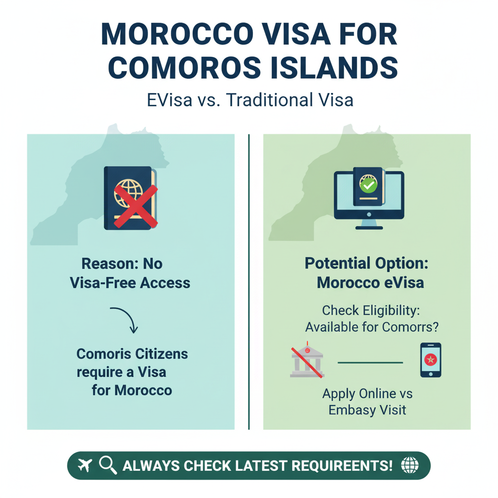 Important: Since Morocco eVisa for Comoros may not yet be open to Comoros nationals via the online route, you may need to apply for a traditional visa process in person.