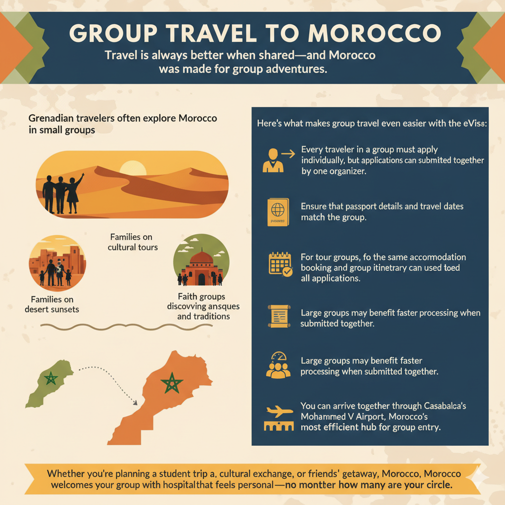 Grenadian travelers often explore Morocco in small groupsâwhether itâs friends chasing desert sunsets together, families on cultural tours, or faith groups discovering ancient mosques and traditions.