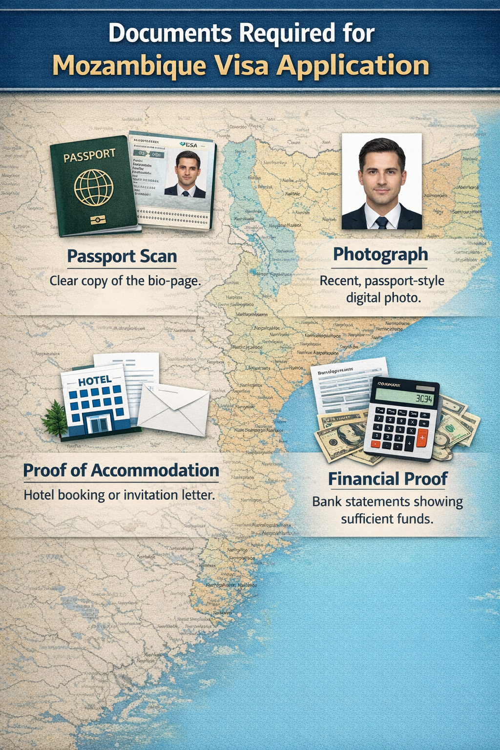 This is a critical requirement. To be approved for a Mozambique eVisa, your passport must be valid for at least 6 months from your date of entry. If your passport expires sooner, immigration authorities will likely reject your application or deny you entry at the border. We strongly recommend renewing your passport before starting the eVisa process.