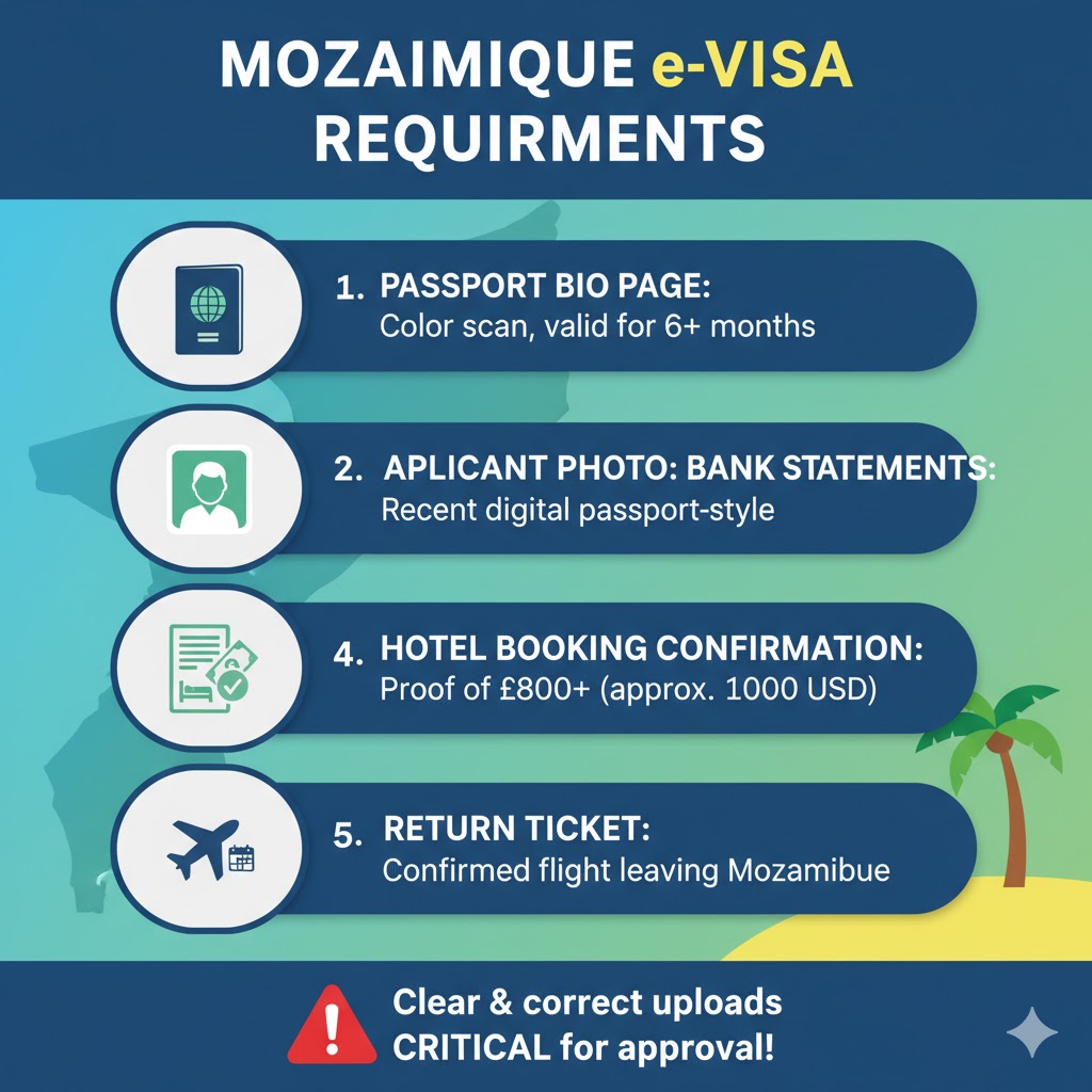 This is the most critical part of your application. The online Mozambique eVisa Required documents you to upload specific documents. Vague or incorrect uploads are the #1 reason for rejection.