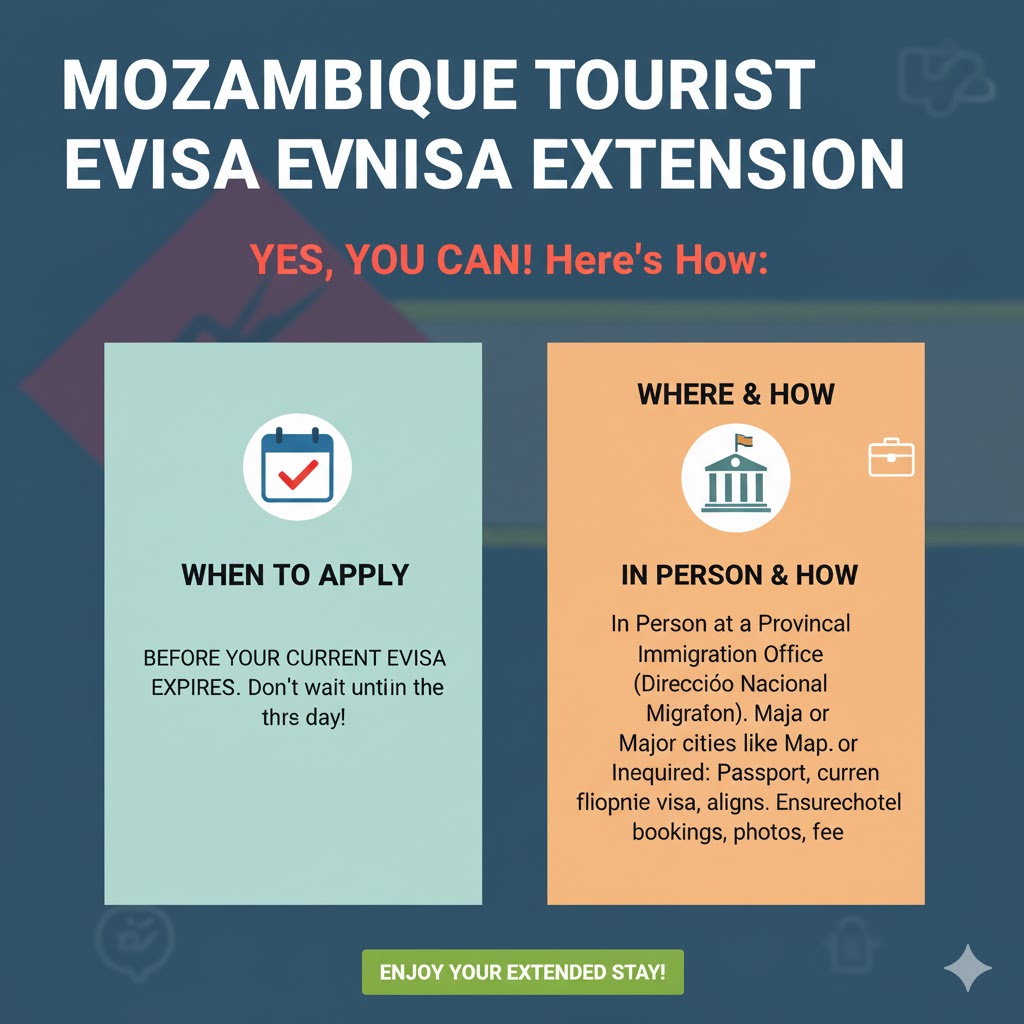 Yes. If you are in Mozambique on your eVisa and decide to stay longer (up to the visa's maximum validity), you can apply for an extension. This must be done in person at a Direcção Nacional de Migração (Immigration Office) in a provincial capital (like Maputo or Inhambane) before your current visa expires.
