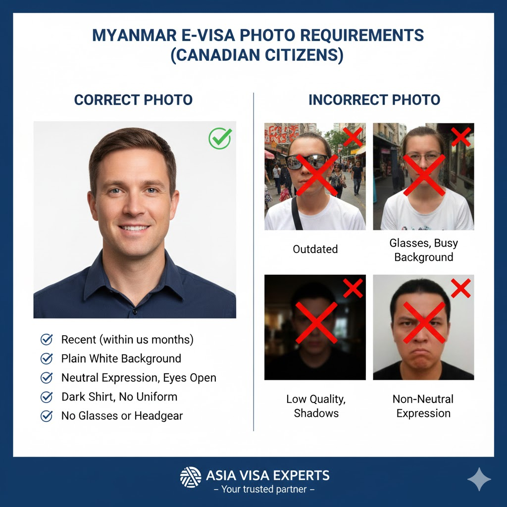 One of the most common reasons for visa rejection is an improper photograph. When applying for your Myanmar eBusiness Visa, ensure your digital photo meets these exact specifications:
