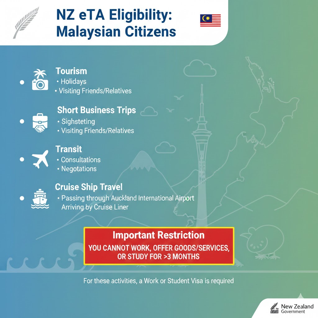 Many Malaysians choose to do a "dual-nation" holiday, flying into Sydney or Melbourne before heading to Auckland. It is crucial to remember that the NZ eTA is valid for New Zealand only.