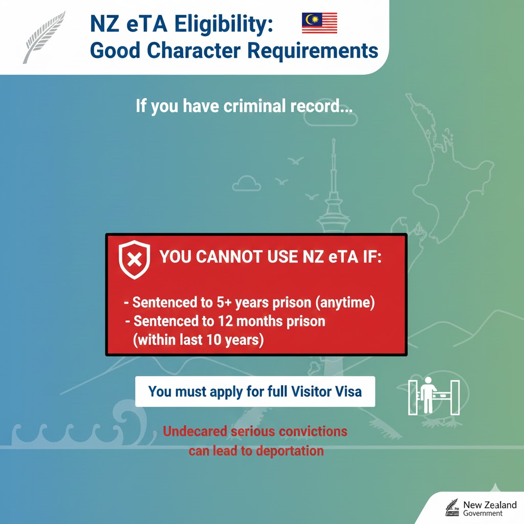 In these cases, even as a Malaysian citizen, you must apply for a full Visitor Visa so your history can be assessed manually. Attempting to travel on an NZ eTA with undeclared serious convictions can lead to deportation upon arrival.